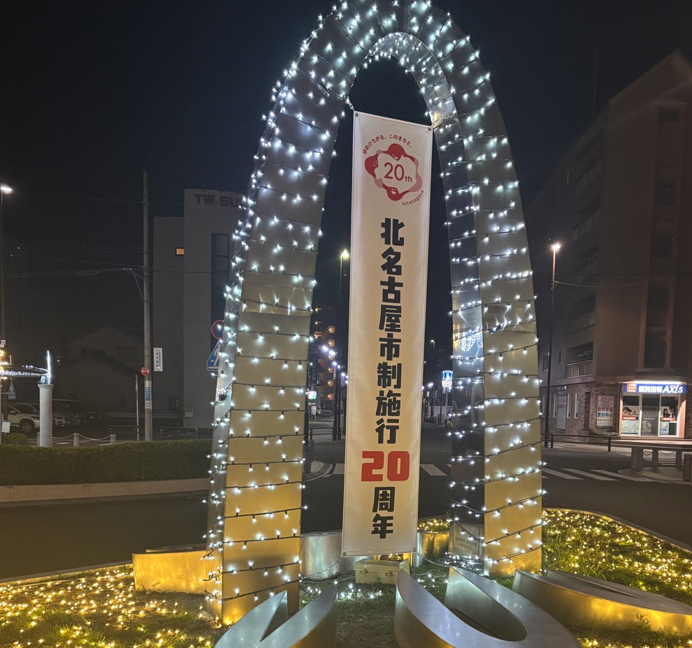 令和8年3月1日の国府宮はだか祭の大鏡餅奉納を北名古屋が担当します。それにちなんで今年はちょっと和風なイルミネーションをデザインしました。大鏡餅のオブジェをライトアップし、その後ろに紅白幕のようなイルミネーションを設置。ご利益がありそうですね!